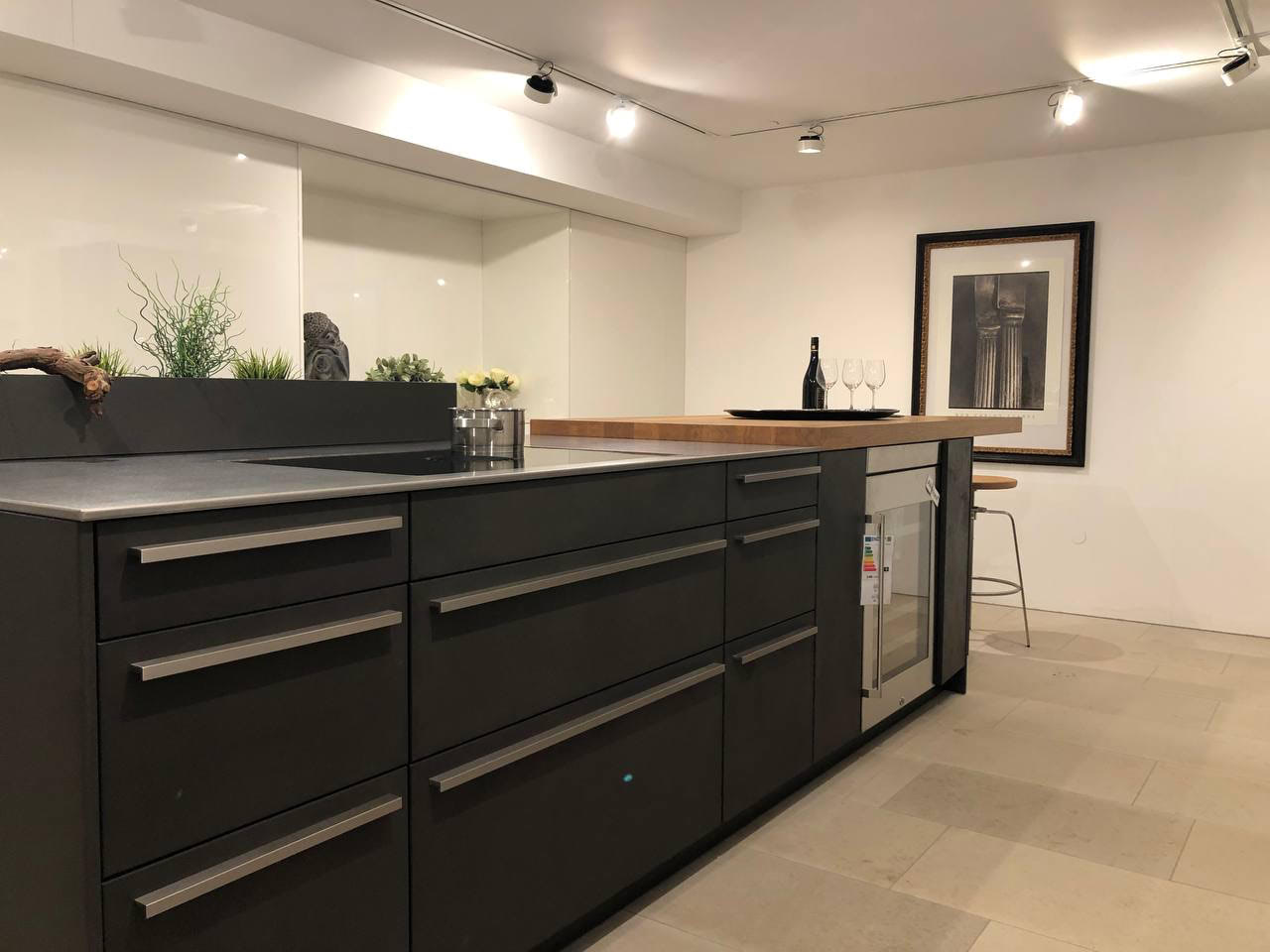 Arbeitsplatten und Wangen aus Keramik anthrazit, inkl. Barplatte aus Thermoesche massiv mit durchgehender Lamelle