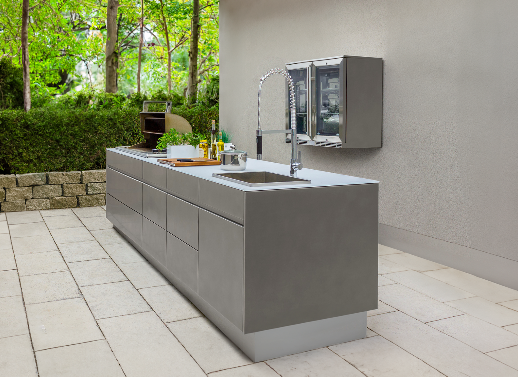 mit satinierter Glas-Arbeitsplatte, Fronten in Edelstahl, Einbau-Gasgrill "Regal 1" von FireMagic, Edelstahl-Spüle von Blanco, Armatur von Dornbracht
